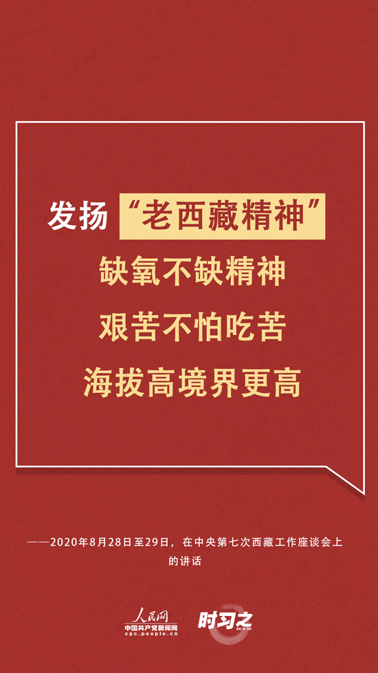 “缺氧不缺精神、艱苦不怕吃苦、海拔高境界更高,在工作中不斷增強(qiáng)責(zé)任感、使命感,增強(qiáng)能力、錘煉作風(fēng)!绷(xí)近平在座談會(huì)上再次為發(fā)揚(yáng)“老西藏精神”作出注解。同時(shí),習(xí)近平也提出要關(guān)心愛護(hù)西藏干部職工,完善好、落實(shí)好工資收入、住房、就醫(yī)、子女入學(xué)、退休安置等各方面支持政策,重視健康保障工作。