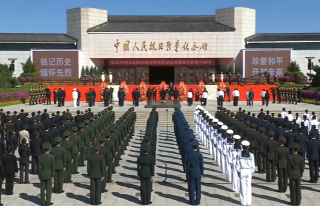 9月3日上午10時(shí),中共中央總書(shū)記、國(guó)家主席習(xí)近平等黨和國(guó)家領(lǐng)導(dǎo)人出席了在中國(guó)人民抗日戰(zhàn)爭(zhēng)紀(jì)念館舉行的紀(jì)念中國(guó)人民抗日戰(zhàn)爭(zhēng)暨世界反法西斯戰(zhàn)爭(zhēng)勝利75周年向抗戰(zhàn)烈士敬獻(xiàn)花籃儀式。在雄壯嘹亮的國(guó)歌聲中,習(xí)近平總書(shū)記同首都各界代表向在中國(guó)人民抗日戰(zhàn)爭(zhēng)中英勇?tīng)奚母锩沂烤传I(xiàn)花籃。