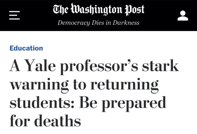 當(dāng)耶魯大學(xué)宣布打算在秋季學(xué)期重啟線下教學(xué)時(shí),該校心理學(xué)教授勞里·桑托斯對(duì)學(xué)生們發(fā)出預(yù)警:返校可能會(huì)帶來(lái)“生死攸關(guān)的后果”。