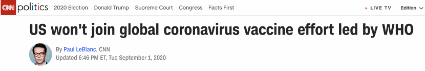 對(duì)此,CNN評(píng)論稱(chēng),特朗普政府在美國(guó)確診病例超過(guò)600萬(wàn)的關(guān)鍵時(shí)刻作出這一決定,將使美國(guó)孤立于參與“新冠肺炎疫苗實(shí)施計(jì)劃(COVAX)”的170多個(gè)國(guó)家之外。