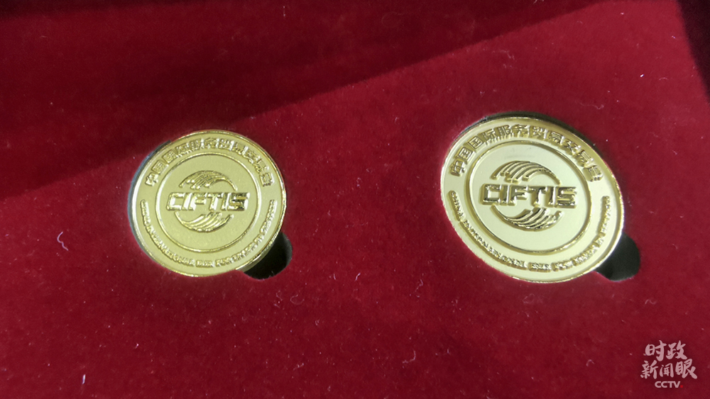 △每位代表座位上都擺有服貿(mào)會紀(jì)念章(總臺央視記者韓銳拍攝)