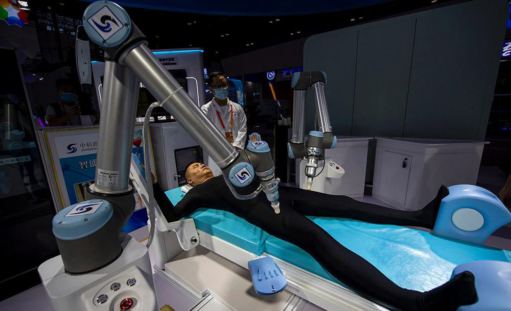 △2020年服貿(mào)會綜合展區(qū),參觀者正在體驗中醫(yī)智能經(jīng)絡(luò)導(dǎo)引機器人。