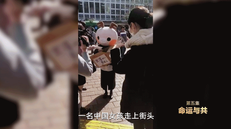 大約20天之后,還是在日本東京,一名中國(guó)女孩走上街頭,頭戴玩偶頭套,向路過(guò)的市民分發(fā)口罩。她手捧的紙箱上寫著“來(lái)自武漢的報(bào)恩”的日語(yǔ)字樣。