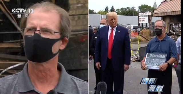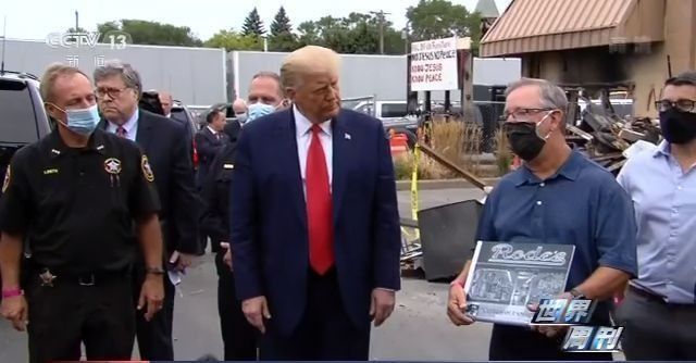 9月1日,在一片廢墟前,特朗普對(duì)商鋪被燒毀的攝影器材店老板羅德表示慰問(wèn),并對(duì)基諾沙市市長(zhǎng)和威斯康星州州長(zhǎng)大加指責(zé),批評(píng)這兩位民主黨人沒(méi)有在第一時(shí)間派遣國(guó)民警衛(wèi)隊(duì)維護(hù)治安。