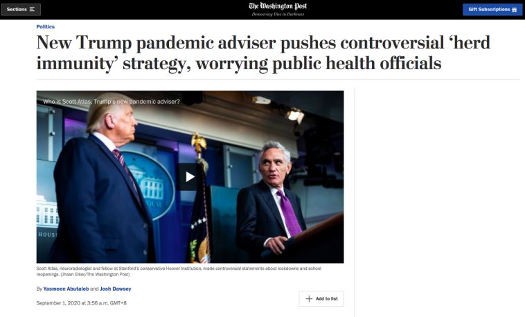 據(jù)《華盛頓郵報(bào)》報(bào)道,放松檢測(cè)的主意來(lái)自于上個(gè)月新上任的白宮新冠小組成員阿特拉斯。阿特拉斯此前是斯坦福大學(xué)醫(yī)學(xué)中心神經(jīng)放射科主任,并非傳染病學(xué)專家,但他積極主張復(fù)工、復(fù)課以及群體免疫等概念,與特朗普觀點(diǎn)一致。
