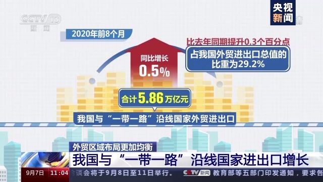 據(jù)海關統(tǒng)計,今年前8個月,我國與“一帶一路”沿線國家外貿(mào)進出口合計5.86萬億元,同比增長0.5%,占我國外貿(mào)進出口總值的比重為29.2%,比去年同期提升0.3個百分點,其中我國與泰國、埃及、波蘭進出口分別增長10.1%、8%和12.3%。