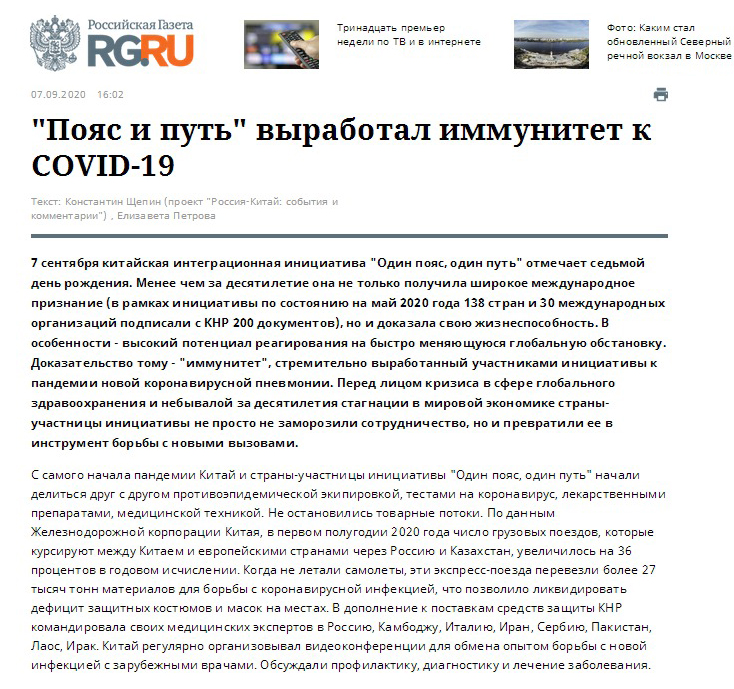 當(dāng)?shù)貢r間9月7日,《俄羅斯報》網(wǎng)站在《中俄銳評》專欄刊發(fā)題為《“一帶一路”賦能全球抗疫》的評論文章。文章稱,9月7日適逢中國提出“一帶一路”倡議七周年。7年來,該倡議得到138個國家和30個國際組織的支持與信任,在應(yīng)對全球挑戰(zhàn)方面展示出強大生命力。面對新冠肺炎疫情導(dǎo)致的全球公共衛(wèi)生危機以及世界經(jīng)濟(jì)蕭條這一前所未有的局面,“一帶一路”沿線國家不僅繼續(xù)保持框架內(nèi)的經(jīng)濟(jì)和項目合作,還特別加強抗疫協(xié)作,共同應(yīng)對全球挑戰(zhàn)。