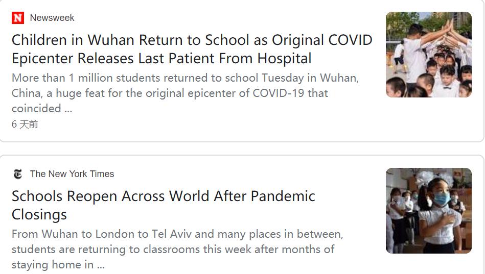 △美國媒體紛紛報道武漢學(xué)校開學(xué)的情況