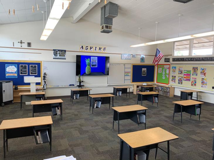 △美國加州的一所學(xué)校加大課桌距離,以迎接即將返校的學(xué)生 圖自當(dāng)?shù)孛襟w