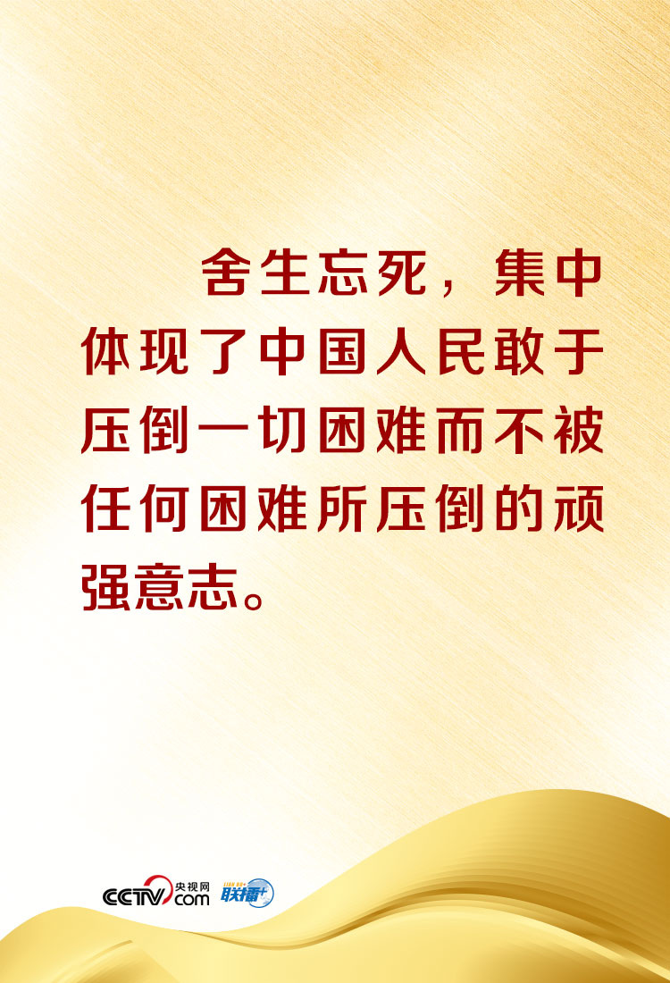“在這場同嚴(yán)重疫情的殊死較量中,中國人民和中華民族以敢于斗爭、敢于勝利的大無畏氣概,鑄就了生命至上、舉國同心、舍生忘死、尊重科學(xué)、命運(yùn)與共的偉大抗疫精神!笨倳涍在講話中特別概括、闡釋了偉大抗疫精神,并深刻指出,偉大抗疫精神,同中華民族長期形成的特質(zhì)稟賦和文化基因一脈相承,是愛國主義、集體主義、社會主義精神的傳承和發(fā)展,是中國精神的生動(dòng)詮釋,豐富了民族精神和時(shí)代精神的內(nèi)涵。央視網(wǎng)《聯(lián)播+》欄目特對相關(guān)內(nèi)容進(jìn)行梳理,與您共同在偉大精神中感受偉大的力量!