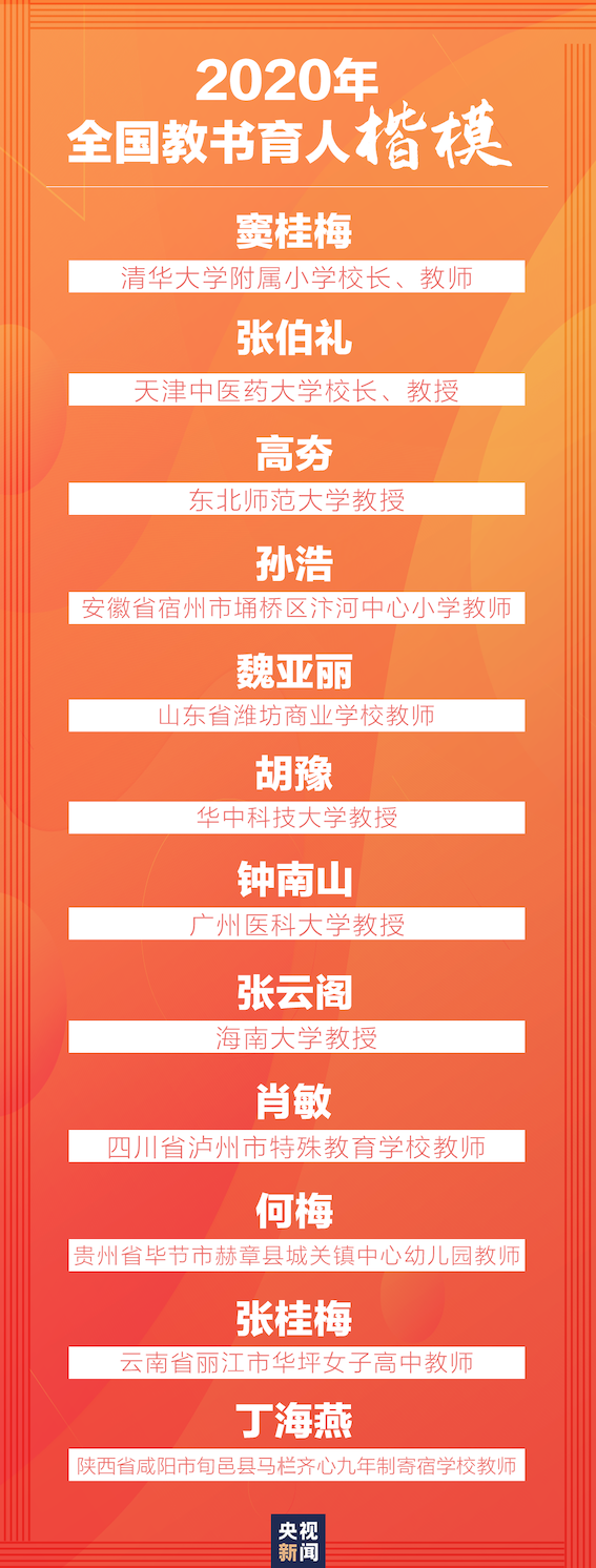 9月4日,2020年全國教書育人楷模名單發(fā)布,首次由中宣部和教育部聯(lián)合表彰,首次增加2個優(yōu)秀抗疫教師名額,共計推出12位“全國教書育人楷!。