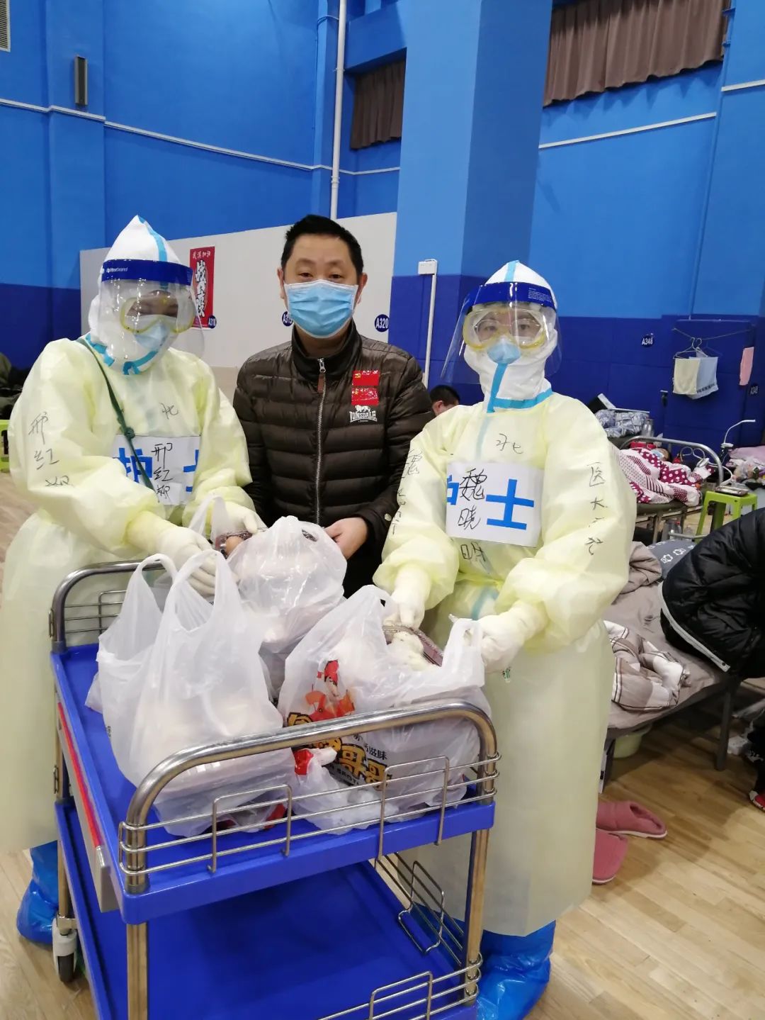 圖為胡惠東在方艙醫(yī)院幫助醫(yī)護人員送飯菜。