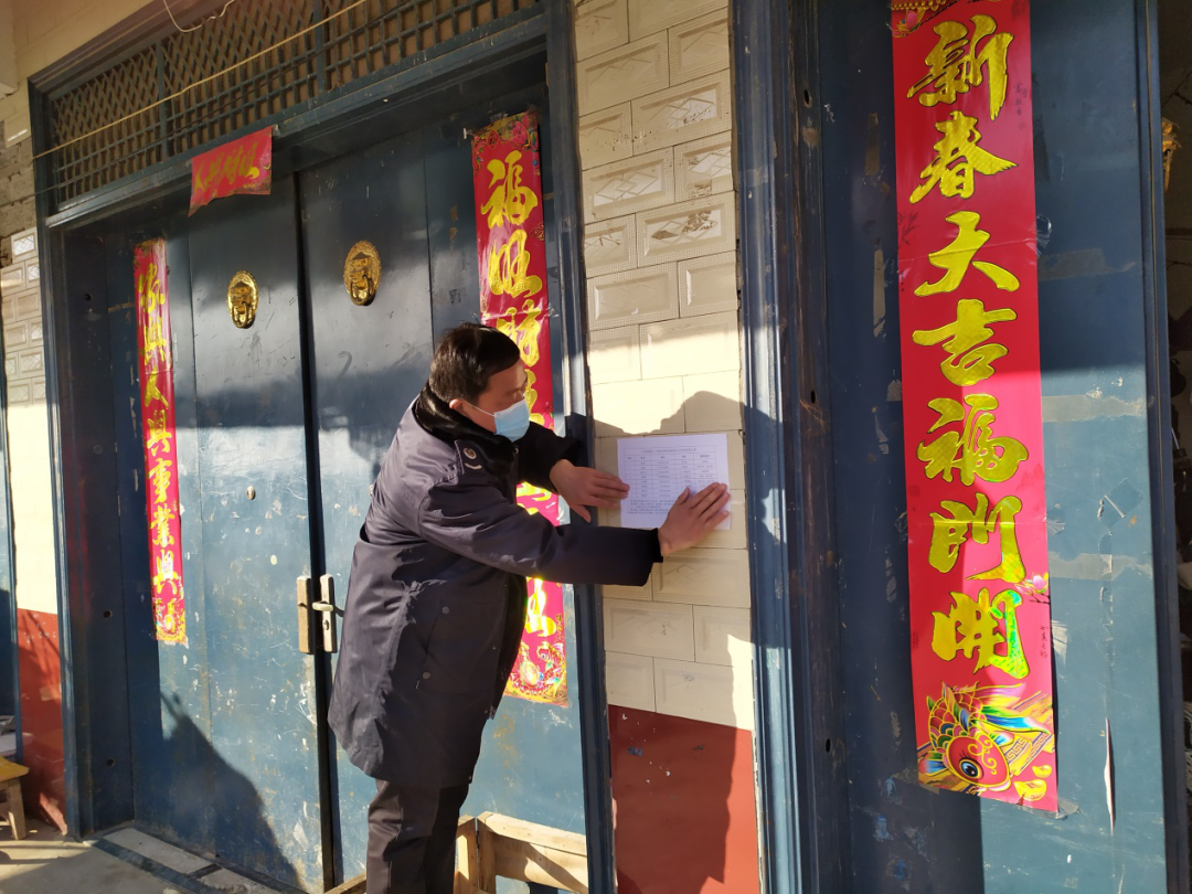 圖為湯玉峰帶領(lǐng)村干部張貼疫情防控排查記錄表。