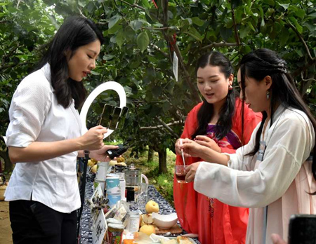 在碭山縣良梨鎮(zhèn)梨園里,鮮果時(shí)光電商公司主播在直播銷售碭山梨、梨膏、黃桃罐頭等。碭山縣委宣傳部 李艷龍攝
