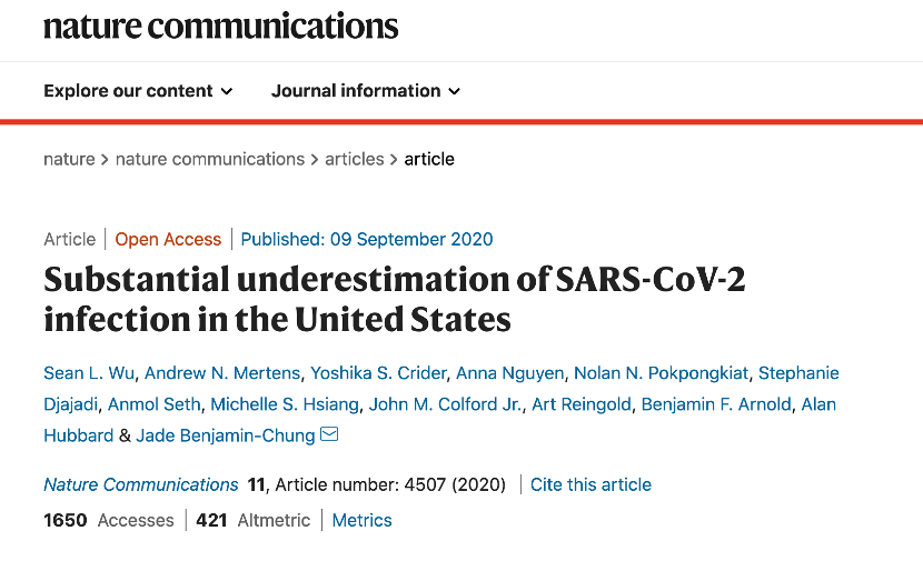 國(guó)際學(xué)術(shù)期刊《自然-通訊》9月9日在線發(fā)表了一篇題為《美國(guó)新冠感染人數(shù)被嚴(yán)重低估》的研究文章。該文章指出,截至4月18日,美國(guó)新冠肺炎感染人數(shù)可能已經(jīng)達(dá)到了640萬(wàn)例,但當(dāng)時(shí)公布的確診病例僅為72萬(wàn)多例。