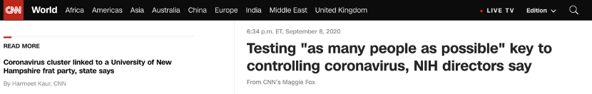 據(jù)美國(guó)有線電視新聞網(wǎng)(CNN)8日?qǐng)?bào)道,來(lái)自美國(guó)國(guó)立衛(wèi)生研究院下屬研究機(jī)構(gòu)美國(guó)國(guó)家兒童健康與人類發(fā)展研究所、美國(guó)國(guó)立醫(yī)學(xué)圖書館、美國(guó)國(guó)立心肺血液研究所、美國(guó)國(guó)立精神衛(wèi)生研究所等單位的11名主任,聯(lián)合撰寫了一篇博文,文章明確指出,“盡可能多地進(jìn)行檢測(cè)”對(duì)于抗擊疫情大流行至關(guān)重要。