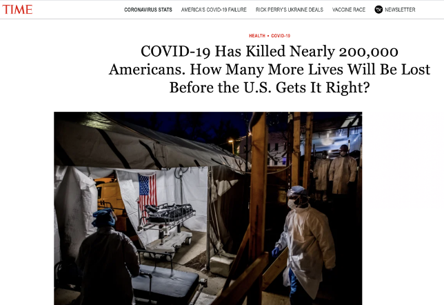 美國(guó)《時(shí)代》周刊在其官網(wǎng)刊文質(zhì)問(wèn):“新冠疫情已經(jīng)奪去近20萬(wàn)美國(guó)人的生命,在美國(guó)走到正確的抗疫路上前,還將付出多少生命的代價(jià)?”