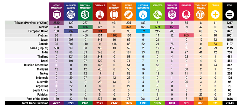 △2019年上半年美國市場貿(mào)易分流(百萬美元),排名前5為中國臺灣省、墨西哥、歐盟、越南、日本