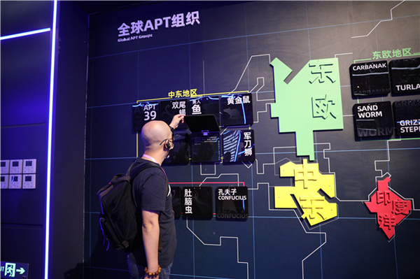 通過全景態(tài)勢互動展示的方式,介紹APTT(高級持續(xù)性威脅)攻擊的源頭、路徑、頻次等知識。中國網(wǎng) 彭瑤 攝