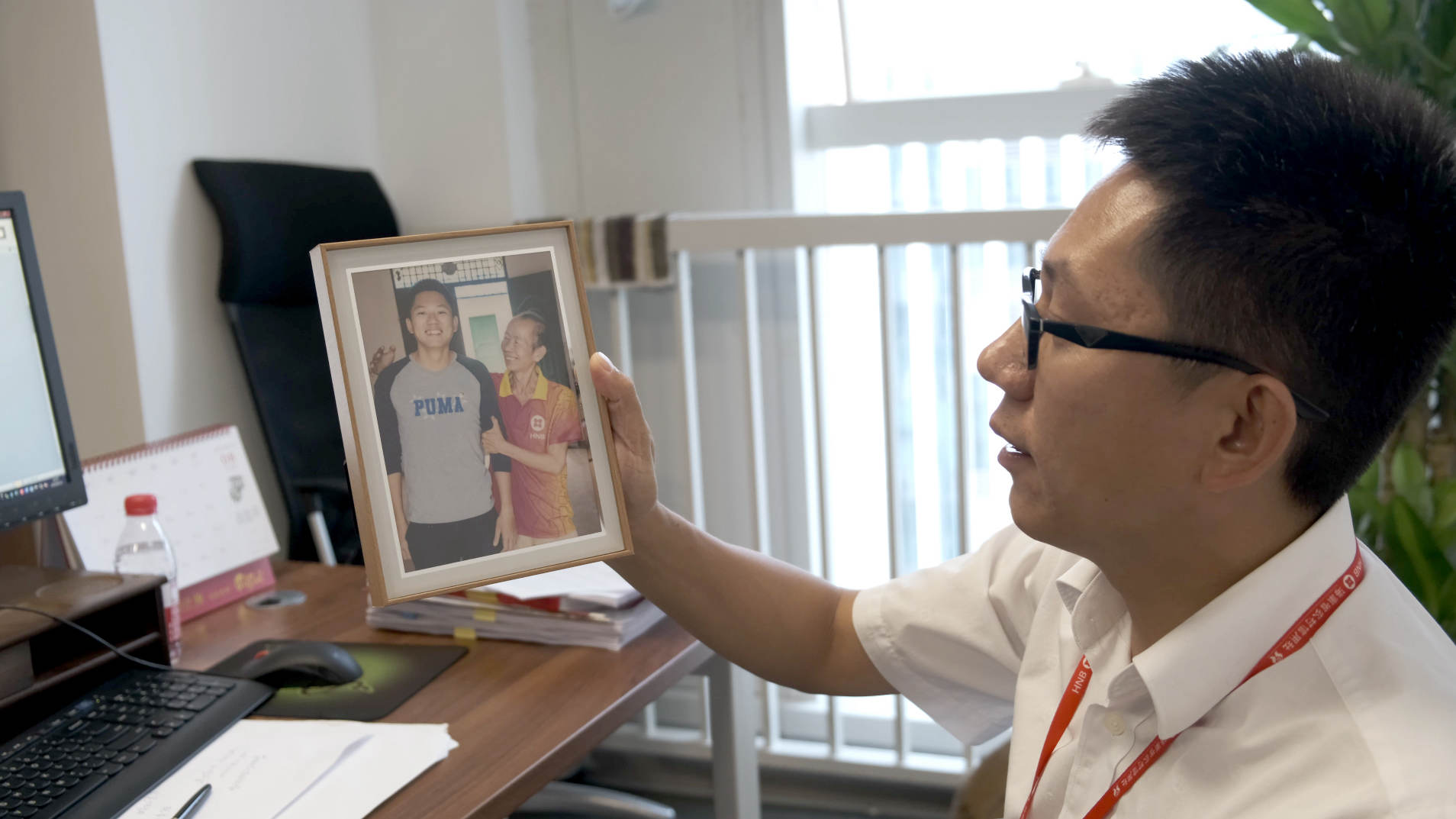 黃海軍的辦公桌上擺著一張他和王成安的合影。張若涵 攝