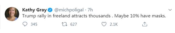 在當(dāng)天的總統(tǒng)競(jìng)選集會(huì)現(xiàn)場(chǎng),《紐約時(shí)報(bào)》記者凱西·格雷在個(gè)人社交媒體上稱:“特朗普的競(jìng)選集會(huì)在弗里蘭聚集了數(shù)千人,但戴口罩的人卻連10%都不到。”