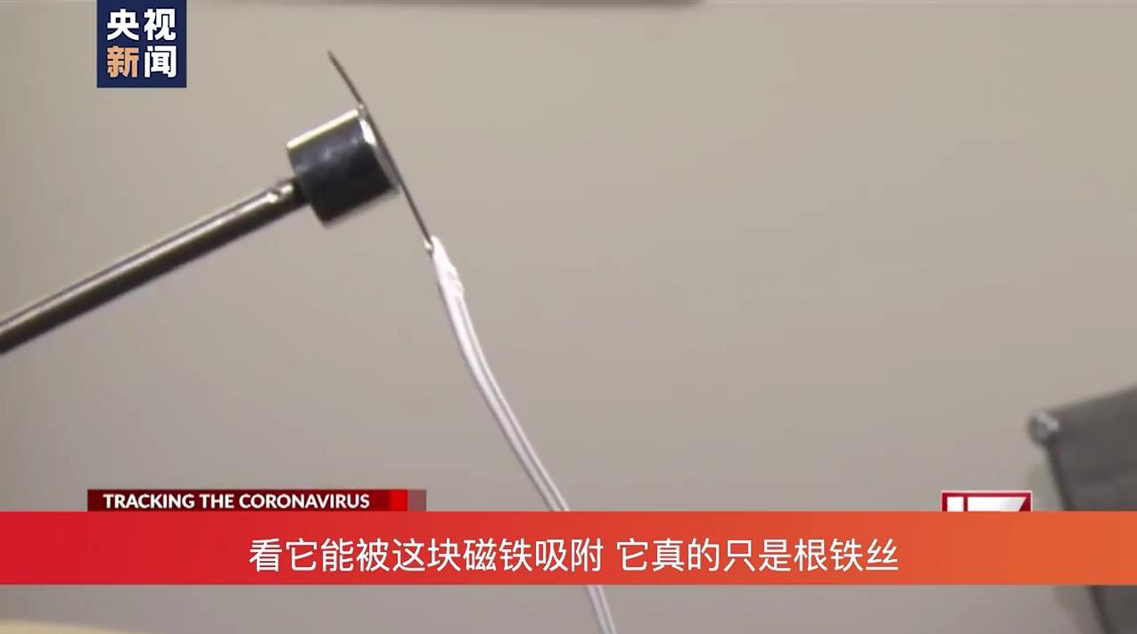 記者在節(jié)目中解釋稱,那條所謂的“5G天線”其實(shí)是由塑料包裹住的一根鋼絲。并且他還用磁鐵演示是如何吸住這根鋼絲的。