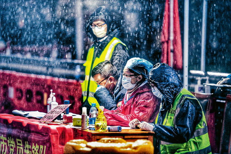 疫情發(fā)生后,廣東省鶴山市廣大黨員、機(jī)關(guān)干部、民警,主動(dòng)放棄休假,24小時(shí)輪值堅(jiān)守崗位,全力打好疫情防控戰(zhàn),切實(shí)維護(hù)人民生命安全和身體健康。圖為2月4日凌晨,鶴山市大雨傾盆,天氣寒冷,黨員干部、醫(yī)務(wù)人員在公安民警、交通執(zhí)法等單位人員配合下,對(duì)進(jìn)入鶴山市的所有車輛人員進(jìn)行體溫檢測(cè)、詢問(wèn)情況。人民圖片 黃繼明/攝