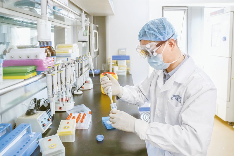2020年4月11日,工作人員在國(guó)藥集團(tuán)中國(guó)生物新冠疫苗生產(chǎn)基地質(zhì)量檢定部門對(duì)新型冠狀病毒滅活疫苗樣品進(jìn)行雜質(zhì)檢測(cè)。新華社記者 張玉薇/攝