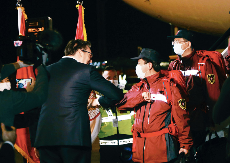 2020年3月21日,在塞爾維亞首都貝爾格萊德,前來(lái)迎接的塞爾維亞總統(tǒng)武契奇(左)與中國(guó)援助塞爾維亞抗疫醫(yī)療專家組成員“碰肘”致意。6名中國(guó)專家當(dāng)天抵達(dá)貝爾格萊德,一批由中國(guó)政府捐贈(zèng)的醫(yī)療物資也同機(jī)抵達(dá)。新華社記者 石中玉/攝