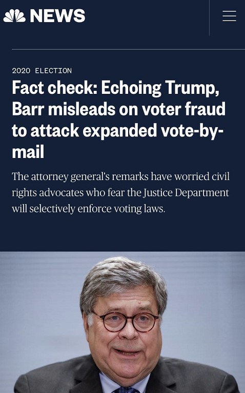 美國全國廣播公司同時指出,美國司法部部長威廉·巴爾一直以來與特朗普一唱一和,已經(jīng)令人擔(dān)心民主的命運,而他就郵寄選票問題更是提出了“一系列誤導(dǎo)性或毫無根據(jù)的主張”,破壞了民眾對選舉和法治的信心。報道列舉了巴爾和特朗普二人相互附和的多條謠言,其中包括:美國沒有大面積處理郵寄選票的經(jīng)驗、郵寄選票會引發(fā)大面積選民欺詐、外國勢力介入操控等。