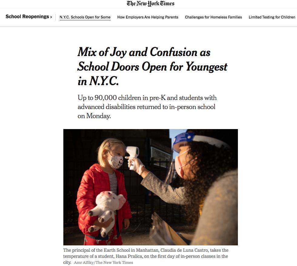 △據(jù)《紐約時(shí)報(bào)》報(bào)道,當(dāng)?shù)貢r(shí)間9月21日,紐約市超9萬名學(xué)前兒童和學(xué)生重返校園。