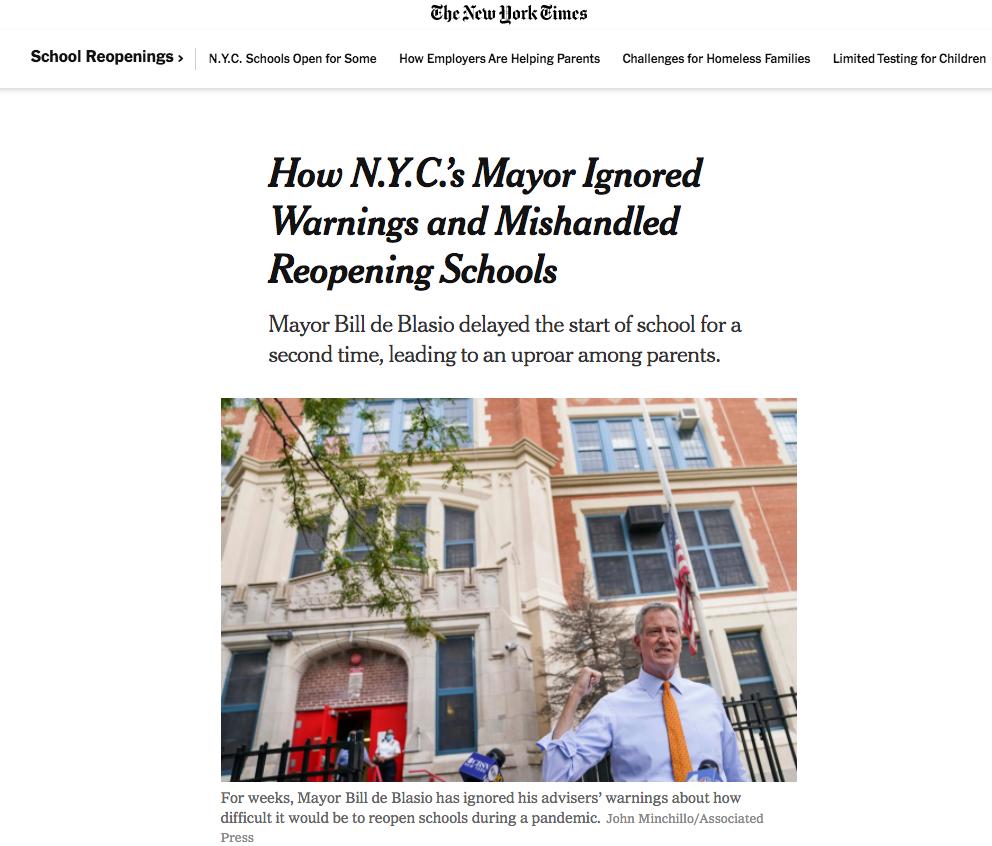 △據(jù)《紐約時(shí)報(bào)》報(bào)道,市長德布拉西奧無視警告,強(qiáng)行重啟校園。