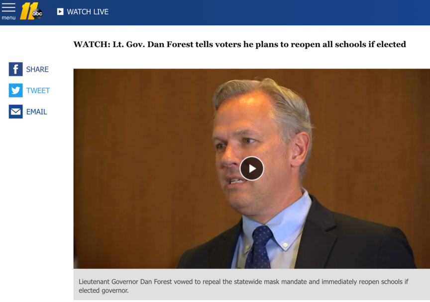 △據(jù)美國廣播公司報(bào)道,北卡羅來納州副州長丹·弗雷斯特告訴選民,他計(jì)劃在當(dāng)選后重新開放所有學(xué)校,并禁在全州范圍內(nèi)廢除口罩強(qiáng)制令。
