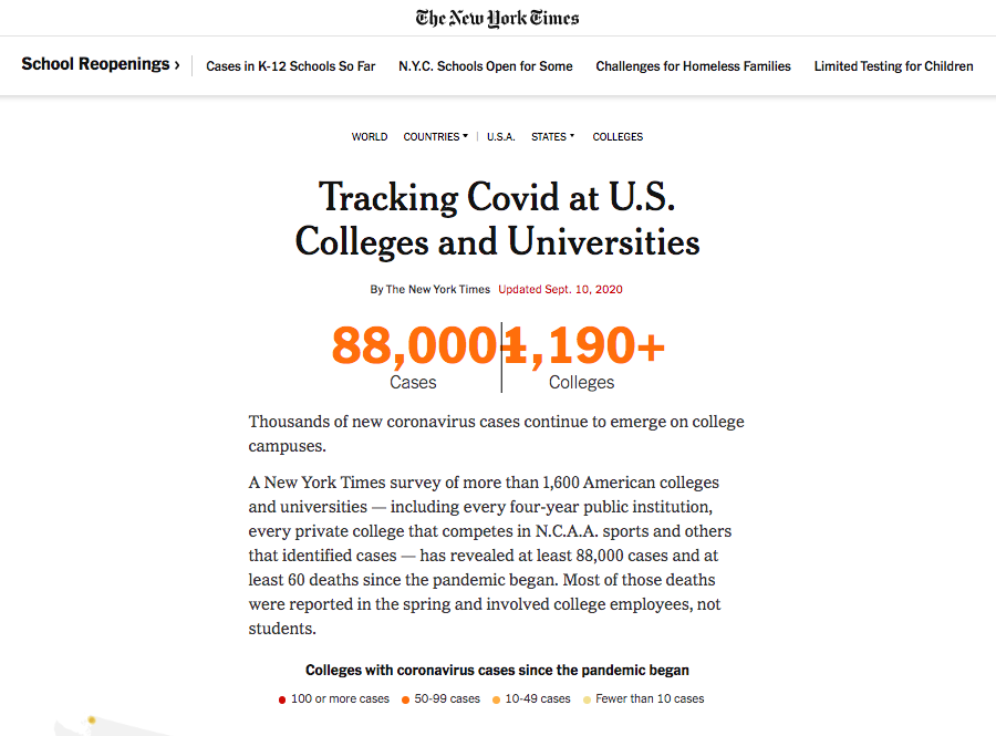 根據(jù)《美國新聞和世界報導(dǎo)》雜志(U.S. News &World Report)和《紐約時報》的報道,自8月各州學(xué)校陸續(xù)開學(xué)以來,美國高等院校中新增新冠病毒感染病例超40000例,基礎(chǔ)教育學(xué)校中新增感染病例超24000例。
