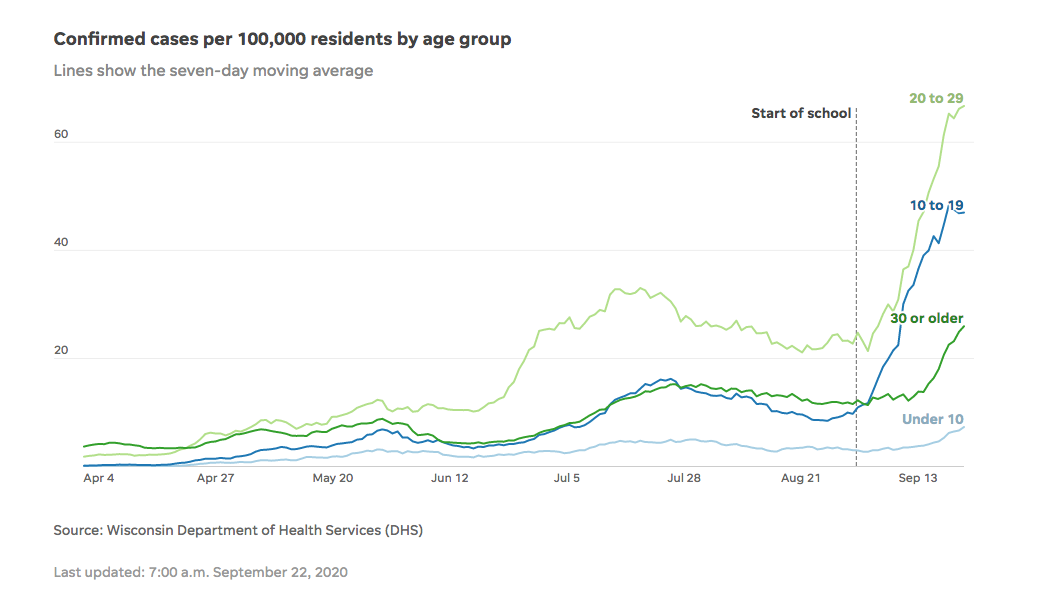 △威斯康星州(Wisconsin)衛(wèi)生服務(wù)部的統(tǒng)計數(shù)據(jù)顯示,自該州的大學(xué)校園陸續(xù)重啟后,新冠新增感染病例開始直線上升。