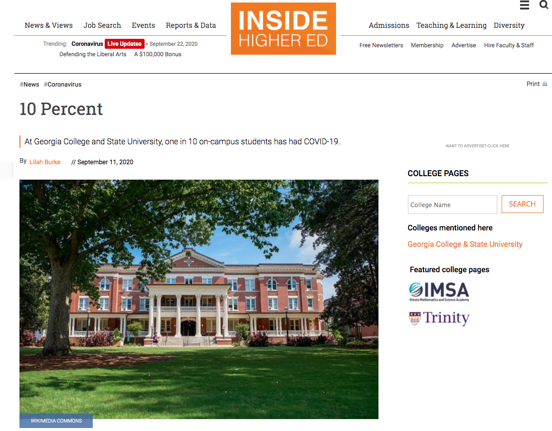 △據(jù)《走進高等教育》(Inside Higher ED)報道,在佐治亞學(xué)院和佐治亞州立大學(xué),每10名在校生中就有1人感染新冠。