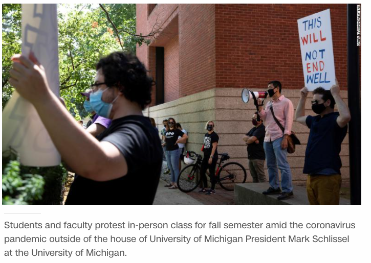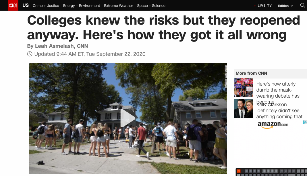 △美國有線電視新聞網(wǎng)報道,高校明知風(fēng)險卻堅持開學(xué),細數(shù)它們的種種錯誤政策。