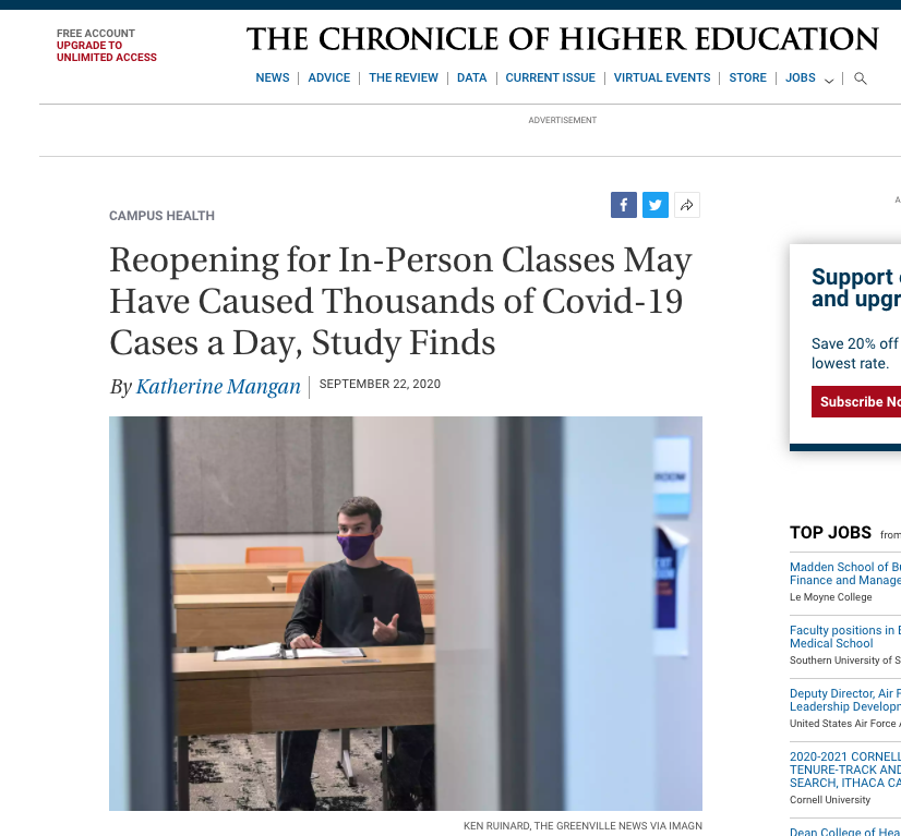 《高等教育紀事》(The Chronicle of Higher Education)稱,美國流行病學(xué)、健康經(jīng)濟和高等教育的人員在戴維森學(xué)院(Davidson College)、印第安納大學(xué)布盧明頓分校(Indiana University at Bloomington)、北卡羅來納大學(xué)格林斯堡分校(The University of North Carolina at Greensboro)和華盛頓大學(xué)(The University of Washington)進行的一項研究得出,重新開放面對面教學(xué),可能已導(dǎo)致這些大學(xué)校園里每天新增約3200個新冠感染病例。