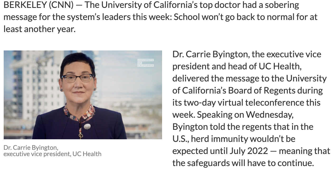 據(jù)美國有線電視新聞網(wǎng)報道,加州大學(xué)(UC)的資深醫(yī)生凱莉·比靈頓(Dr.Carrie Byington)多次向政府發(fā)出警告并預(yù)測道,美國學(xué)校至少一年后才能恢復(fù)正常,直到2022年7月才有望實現(xiàn)群體免疫。