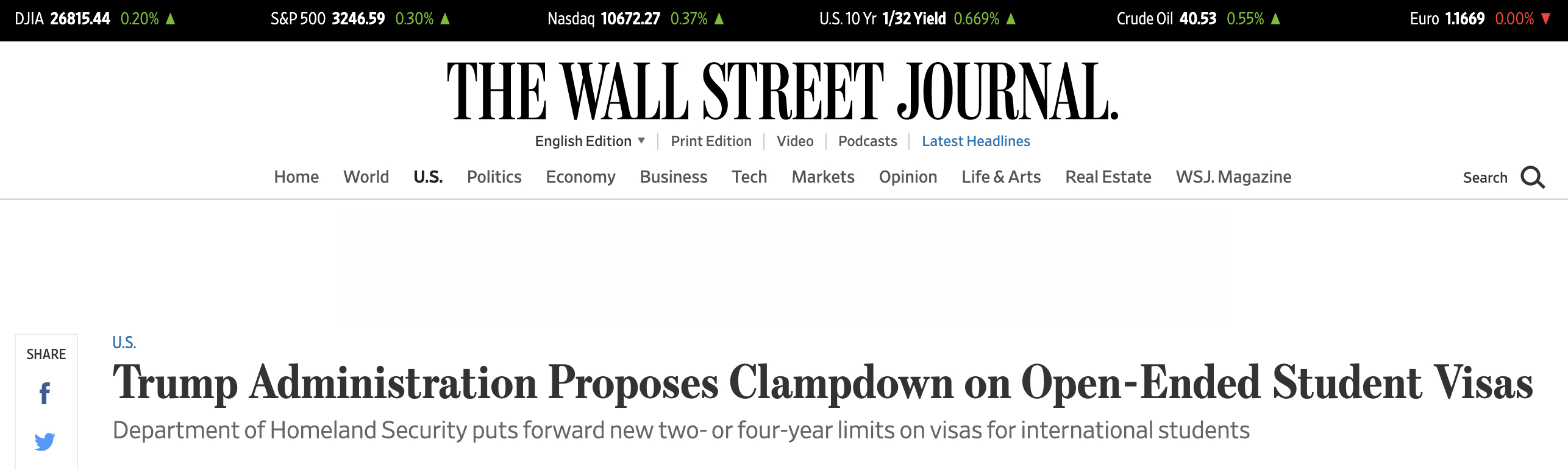 《華爾街日?qǐng)?bào)》報(bào)道稱,今年,由于美國(guó)政府的移民政策和因新冠疫情而采取的旅行限制,許多學(xué)校的留學(xué)生入學(xué)人數(shù)都出現(xiàn)了下降。