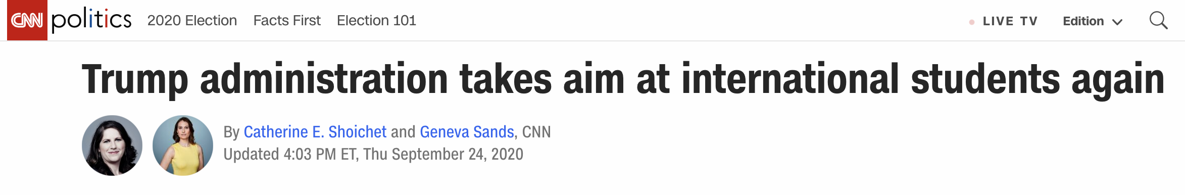 CNN報(bào)道稱,這并非特朗普政府首次拿留學(xué)生“開刀”。今年7月,美國(guó)政府曾出臺(tái)一項(xiàng)涉留學(xué)生簽證的新規(guī),稱不會(huì)給在秋季學(xué)期僅上網(wǎng)課的留學(xué)生發(fā)放簽證,也將不允許這些學(xué)生進(jìn)入美國(guó)。