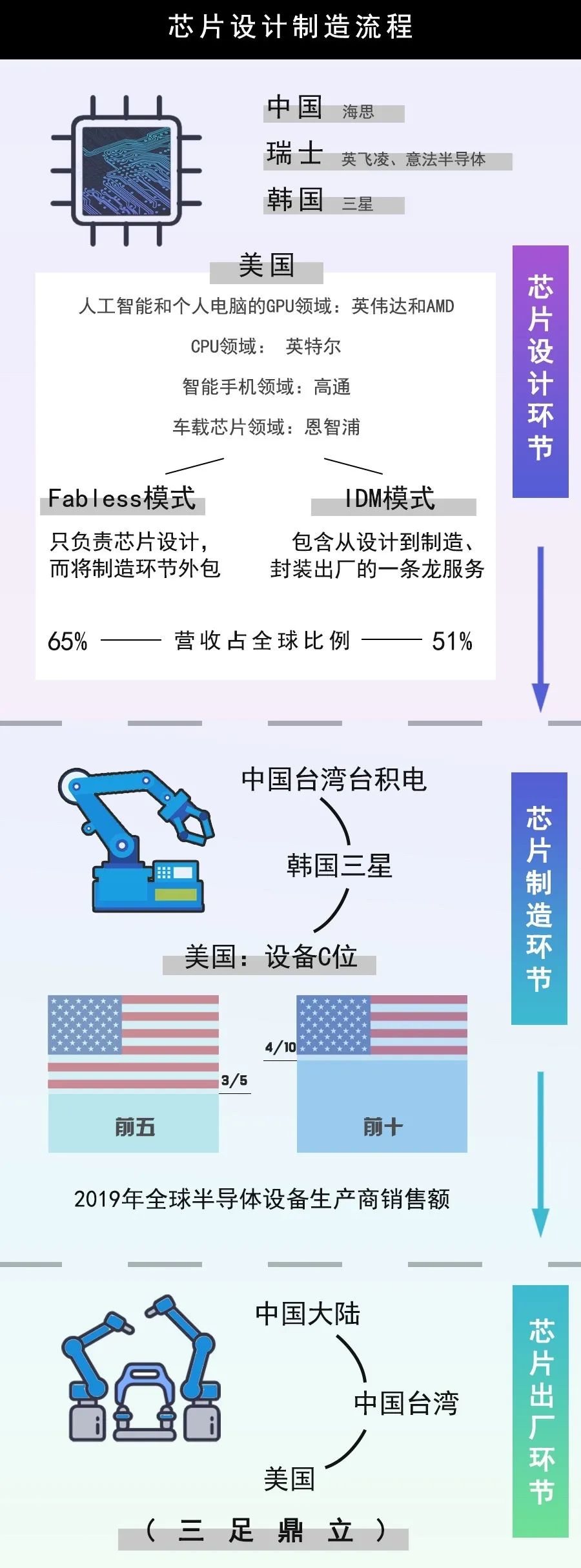 ▲ 滑動查看芯片設(shè)計(jì)制造全流程中各國位置
