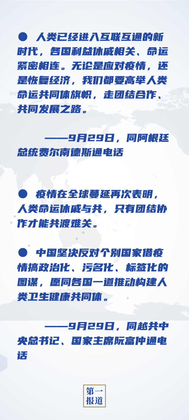 “團(tuán)結(jié)合作是最有力的武器”“唯有相互支持、團(tuán)結(jié)合作才是戰(zhàn)勝危機(jī)的人間正道”……今年以來(lái),面對(duì)疫情挑戰(zhàn),習(xí)主席在各種雙多邊場(chǎng)合反復(fù)提到“團(tuán)結(jié)”一詞,號(hào)召世界各國(guó)團(tuán)結(jié)合作、共克時(shí)艱。9月22日,在第七十五屆聯(lián)合國(guó)大會(huì)一般性辯論上發(fā)表重要講話(huà)時(shí),習(xí)主席面向國(guó)際社會(huì)發(fā)出“讓我們團(tuán)結(jié)起來(lái)”的真誠(chéng)呼吁。29日,在習(xí)主席同阿根廷、越南領(lǐng)導(dǎo)人的通話(huà)中,“團(tuán)結(jié)”這一中國(guó)外交高頻詞再次出現(xiàn):