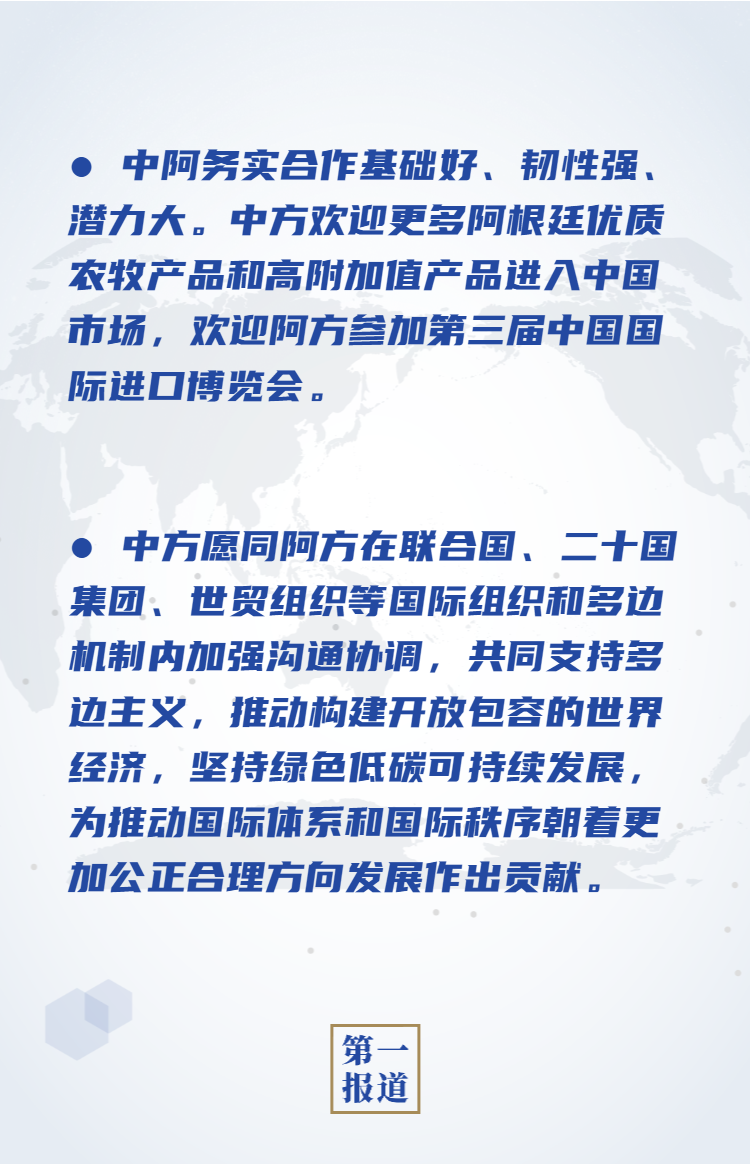 習(xí)近平強(qiáng)調(diào),中方高度重視同阿根廷的關(guān)系,支持阿方發(fā)展經(jīng)濟(jì)、改善民生,對(duì)中阿合作未來(lái)充滿(mǎn)信心。中國(guó)將全面提高對(duì)外開(kāi)放水平,推動(dòng)形成以國(guó)內(nèi)大循環(huán)為主體、國(guó)內(nèi)國(guó)際雙循環(huán)相互促進(jìn)的新發(fā)展格局。這將為包括阿根廷在內(nèi)的世界各國(guó)提供廣闊市場(chǎng)和發(fā)展機(jī)會(huì)。中阿務(wù)實(shí)合作基礎(chǔ)好、韌性強(qiáng)、潛力大。中方歡迎更多阿根廷優(yōu)質(zhì)農(nóng)牧產(chǎn)品和高附加值產(chǎn)品進(jìn)入中國(guó)市場(chǎng),歡迎阿方參加第三屆中國(guó)國(guó)際進(jìn)口博覽會(huì)。雙方應(yīng)落實(shí)好現(xiàn)有重大項(xiàng)目,開(kāi)辟合作新疆域,深化人文交流,推動(dòng)中阿全面戰(zhàn)略伙伴關(guān)系取得更大發(fā)展。