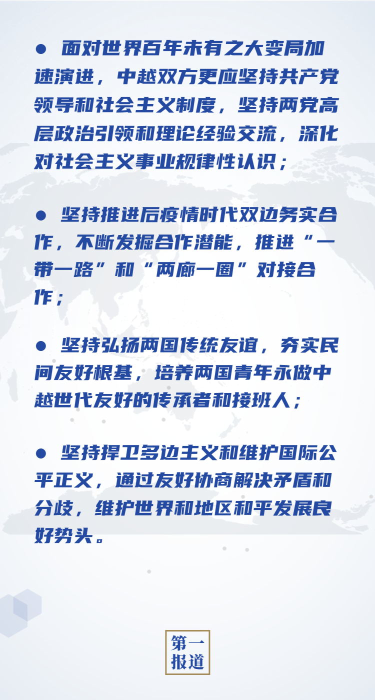 習(xí)近平強(qiáng)調(diào),中國(guó)和越南山水相連,兩國(guó)在意識(shí)形態(tài)、發(fā)展道路、社會(huì)制度、價(jià)值理念等方面高度一致,把雙邊關(guān)系發(fā)展好符合兩國(guó)和兩國(guó)人民根本利益。今年是中越建交70周年,兩黨兩國(guó)關(guān)系邁上新的歷史起點(diǎn)。疫情之下中越雙邊貿(mào)易等合作呈現(xiàn)出強(qiáng)勁增長(zhǎng)勢(shì)頭,彰顯了中越關(guān)系的韌性和潛力。面對(duì)世界百年未有之大變局加速演進(jìn),中越雙方更應(yīng)堅(jiān)持共產(chǎn)黨領(lǐng)導(dǎo)和社會(huì)主義制度,堅(jiān)持兩黨高層政治引領(lǐng)和理論經(jīng)驗(yàn)交流,深化對(duì)社會(huì)主義事業(yè)規(guī)律性認(rèn)識(shí);堅(jiān)持推進(jìn)后疫情時(shí)代雙邊務(wù)實(shí)合作,不斷發(fā)掘合作潛能,推進(jìn)“一帶一路”和“兩廊一圈”對(duì)接合作;堅(jiān)持弘揚(yáng)兩國(guó)傳統(tǒng)友誼,夯實(shí)民間友好根基,培養(yǎng)兩國(guó)青年永做中越世代友好的傳承者和接班人;堅(jiān)持捍衛(wèi)多邊主義和維護(hù)國(guó)際公平正義,通過(guò)友好協(xié)商解決矛盾和分歧,維護(hù)世界和地區(qū)和平發(fā)展良好勢(shì)頭。中國(guó)共產(chǎn)黨支持越南共產(chǎn)黨開(kāi)好十三大,愿繼續(xù)為越南社會(huì)主義建設(shè)事業(yè)提供力所能及的支持和幫助。
