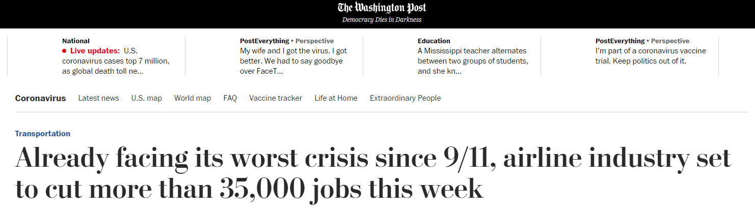 《華盛頓郵報》直言,特朗普政府對新冠疫情輕描淡寫,抗擊疫情不力,管理不當(dāng),令大部分航空公司員工失去生活信心。
