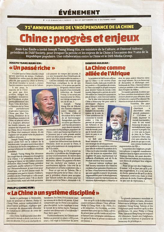 在中華人民共和國成立71周年之際,毛里求斯主流媒體《挑戰(zhàn)報》推出中國專題報道,通過旗下報紙、電臺、網(wǎng)絡(luò)、社交媒體等多個平臺,圍繞中國國家治理、經(jīng)濟(jì)發(fā)展、抗擊疫情等議題,采訪了中、毛相關(guān)領(lǐng)域知名人士。