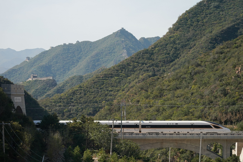 一列復(fù)興號(hào)高鐵列車(chē)從京張高鐵駛過(guò)居庸關(guān)長(zhǎng)城(10月6日攝)。新華社記者 鞠煥宗 攝