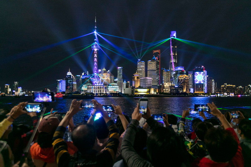 人們?cè)谏虾M鉃┯^賞燈光秀(10月5日攝)。新華社記者 王翔 攝