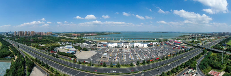 這是滬寧高速公路蘇州段陽(yáng)澄湖服務(wù)區(qū)(10月8日攝,無(wú)人機(jī)全景拼接照片)。陽(yáng)澄湖服務(wù)區(qū)于2019年5月完成升級(jí)改造,通過(guò)大型水景等元素還原“詩(shī)畫(huà)江南”意境,成為當(dāng)?shù)氐摹靶戮包c(diǎn)”。新華社記者 李博 攝